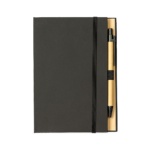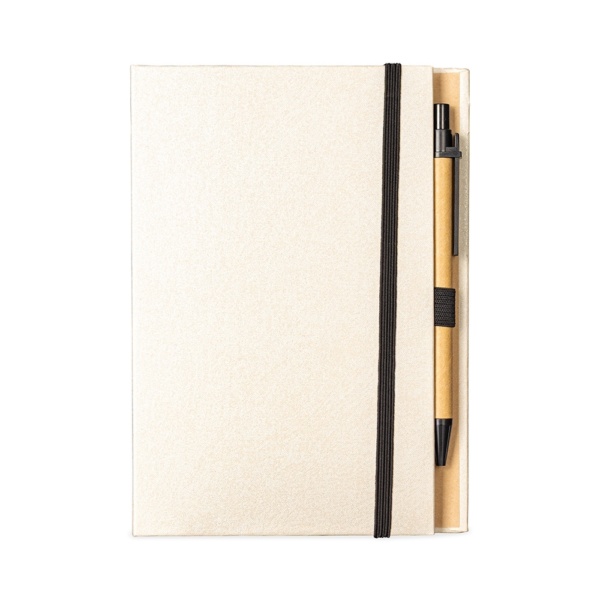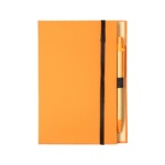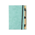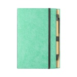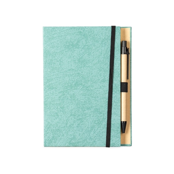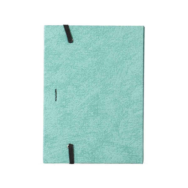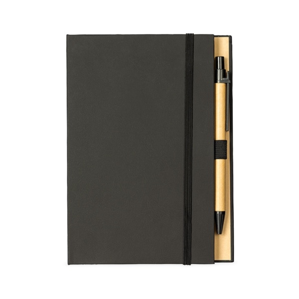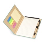 Descrição: Bloco de anotações com capa dura revestida em papel especial e fita elástica para fechamento. Possui cerca de 80 folhas pautadas, além de um bloco com aproximadamente 20 folhas autoadesivas amarelas e por volta de 100 marcadores de página autoadesivos, divididos em cinco cores diferentes. Acompanha uma caneta esferográfica com carga azul de 1.0mm e acionamento por clique, corpo em papelão e demais componentes em plástico.