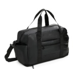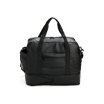 Descrição: Bolsa em filme sintético tipo couro impermeável, com até 44 litros de capacidade após expansão inferior. Possui compartimento interno com bolso menor e outros quatro externos: um com botão magnético, um para calçados, um aberto e outro com zíper e encaixe para malas. Possui um par de alças laterais de mão e uma alça transversal removível.