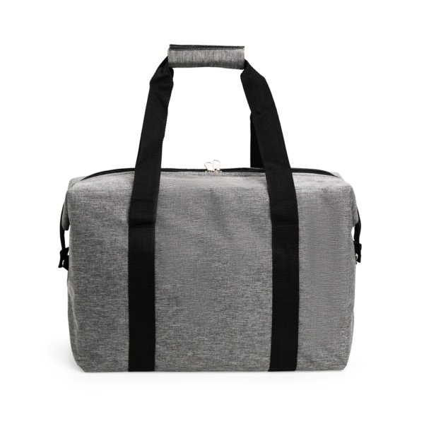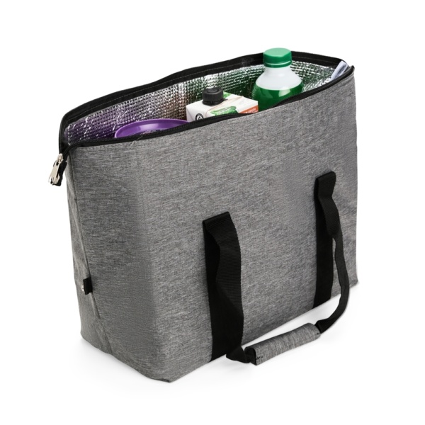 Descrição: Bolsa térmica confeccionada em Oxford resistente à água, fechamento em zíper e capacidade de até 20 litros. Possui revestimento térmico interno em folha de alumínio, botões laterais de metal para junção, bolso externo e alças de mão em nylon com suporte de união por velcro.