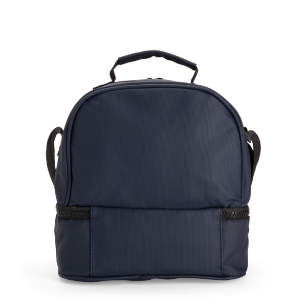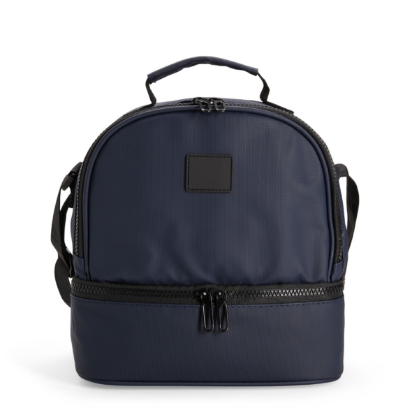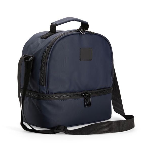 Descrição: Bolsa térmica confeccionada em poliéster mesclado com PVC impermeável, fechamento em zíper e capacidade de até 7 litros na soma de seus dois compartimentos térmicos individuais revestidos em PEVA atóxico. Conta com placa emborrachada para personalização, uma alça de mão e alça transversal.