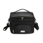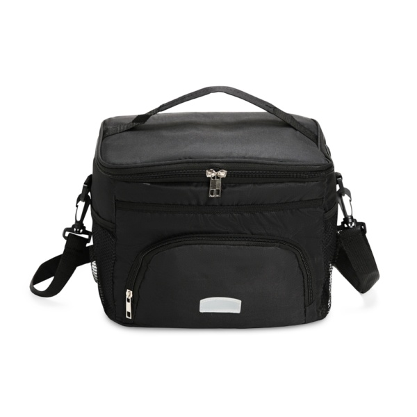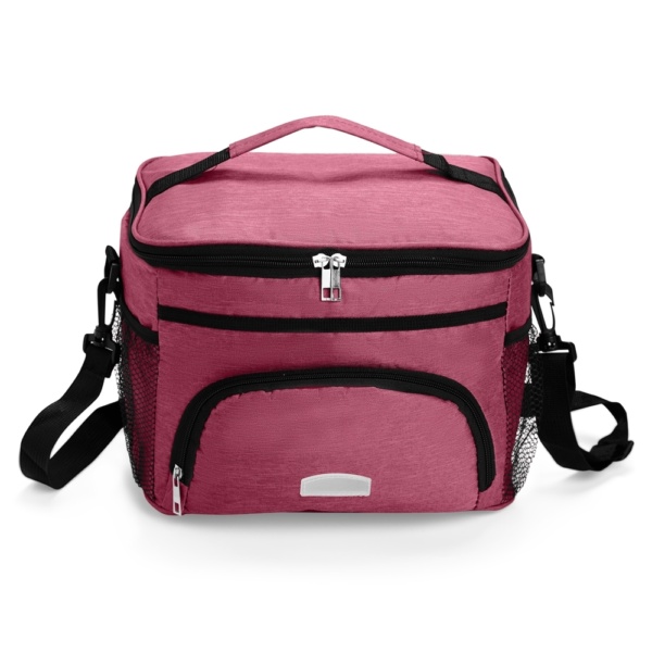 Descrição: Bolsa térmica confeccionada em poliéster resistente à água e capacidade de até 10 litros. Possui revestimento térmico interno em PVC laminado, dois bolsos laterais em tela, bolso frontal com zíper e duas alças: uma superior fixa e outra transversal removível.