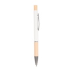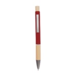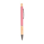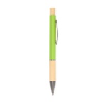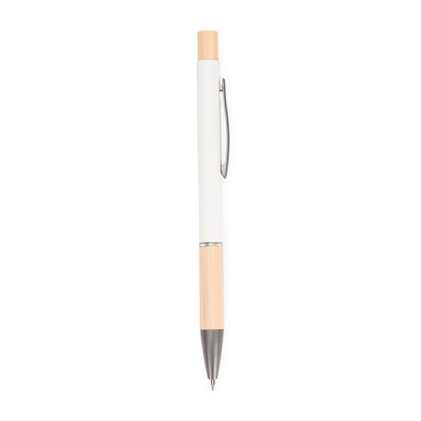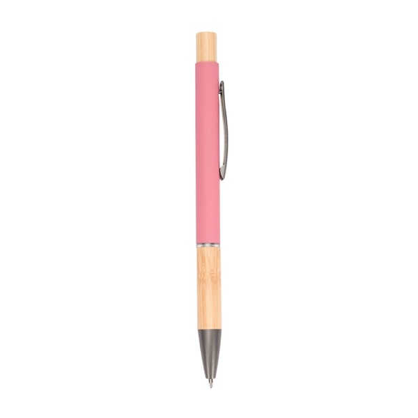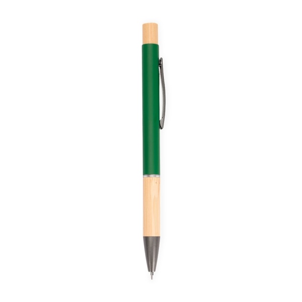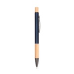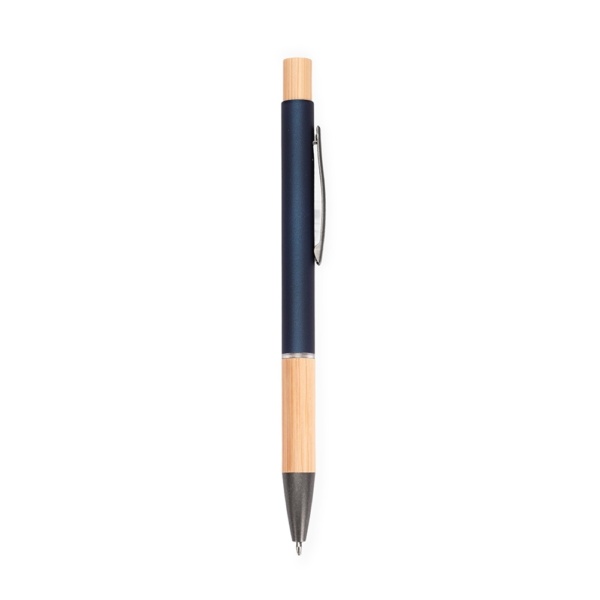 Descrição: Caneta com carga esferográfica azul de 1.0mm. Apresenta corpo metálico, detalhes em bambu e acionamento por clique, oferecendo uma pegada leve para uma escrita precisa.