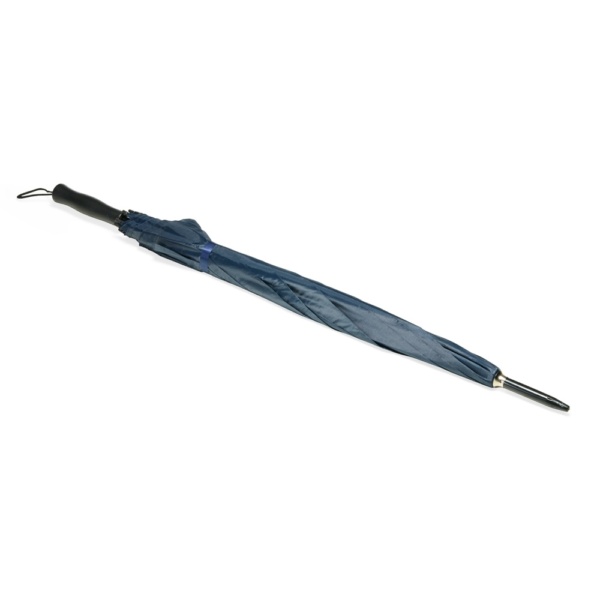 Descrição: Guarda-chuva em poliéster com abertura automática, estrutura metálica com oito varetas e pegador em plástico com alça de nylon fixa na extremidade.