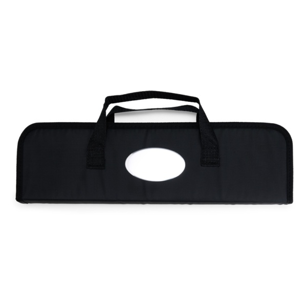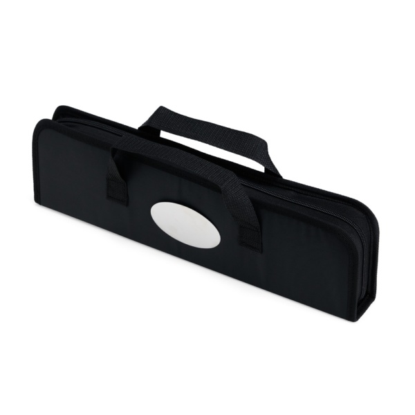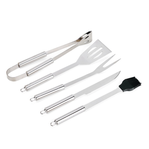 Descrição: Um kit ideal para acompanhar momentos de confraternização marcantes que apenas um bom churrasco pode proporcionar. O nosso kit traz 5 itens em aço inox indispensáveis para preparar um bom churrasco: 1 faca de 6,2 polegadas de lâmina, um garfo, 1 espátula, 1 pincel com cerdas de silicone e 1 pegador. Além disso, ele acompanha um estojo de nylon com um par de alças fixas para dar maior facilidade de transporte, além de uma placa metálica personalizável com verso autoadesivo.