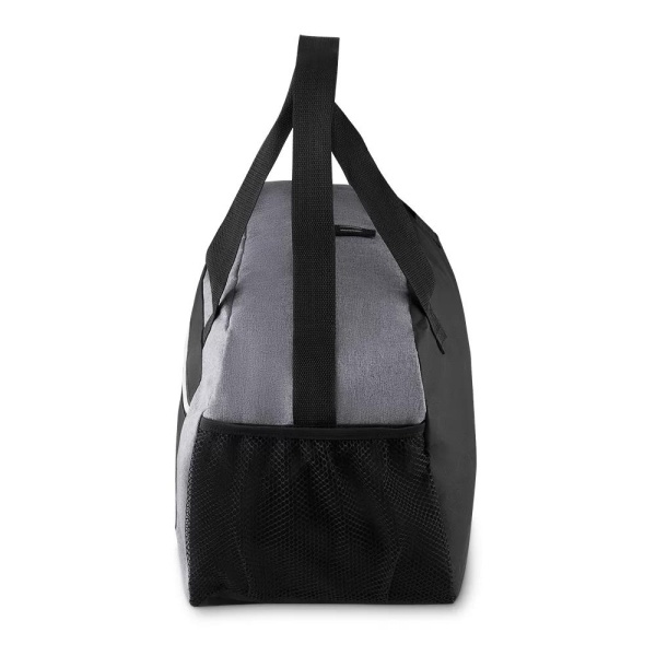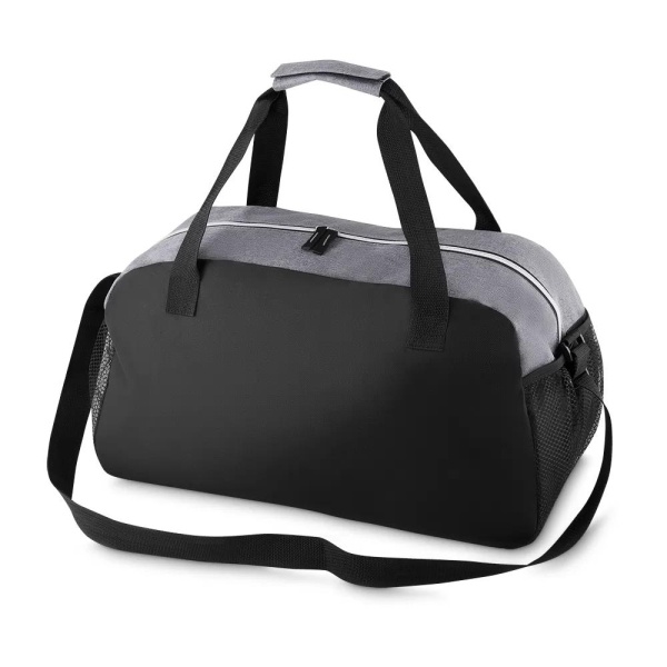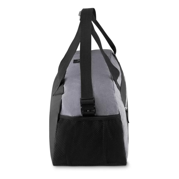 Mala esportiva de poliéster. Possui alça de mão com pegador cinza de velcro, alça ajustável para as costas e bolsos laterais de malha.