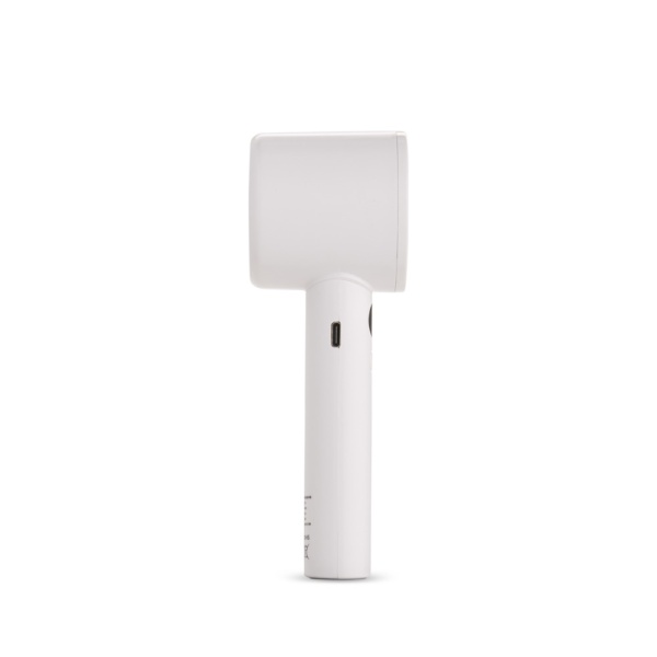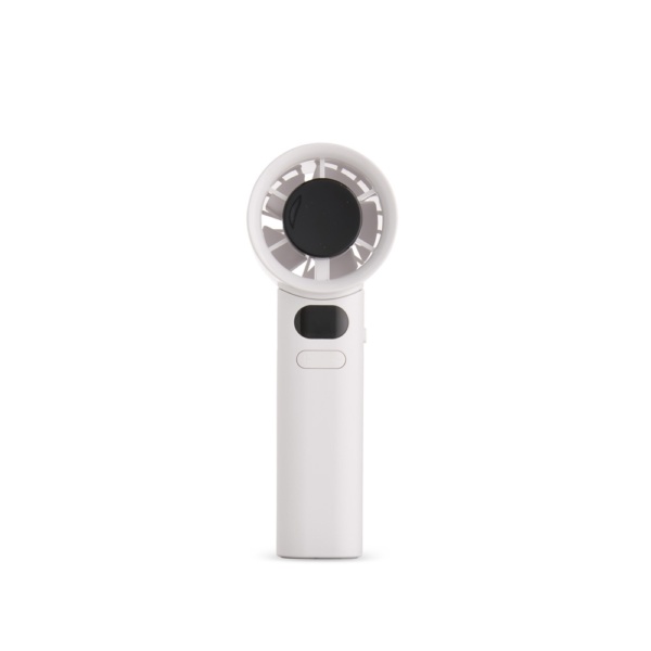 Descrição: Mini ventilador recarregável em plástico e metal. Possui controle de velocidade ajustado por botões frontais, acionamento por chave seletora e painel de LED que exibe níveis de velocidade e carga da bateria. Acompanha cabo USB-C e cordão em nylon.