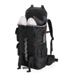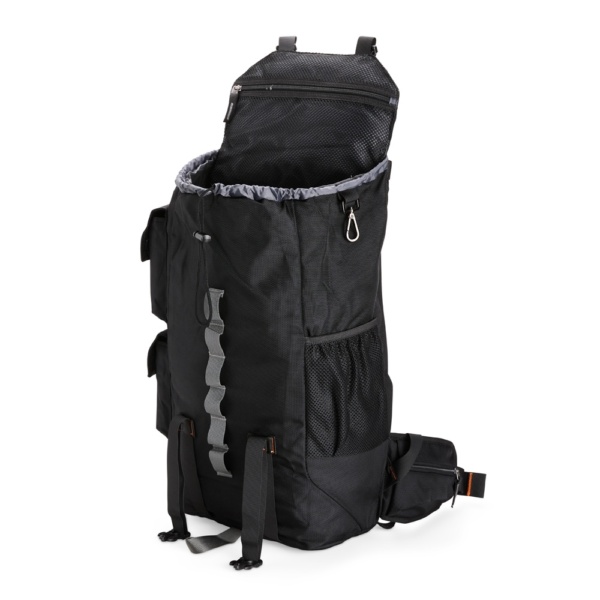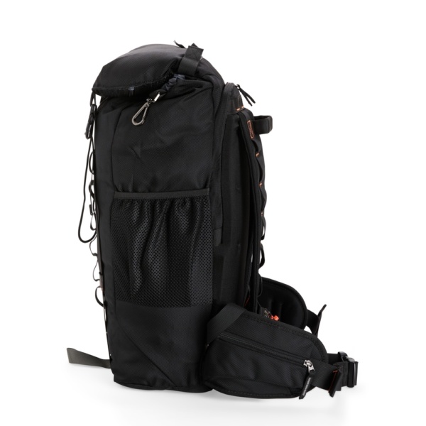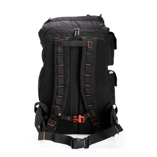 Descrição: Mochila confeccionada em poliéster impermeável, fechamento por cordão e engate rápido plástico e capacidade máxima de 25 litros. Possui amplo espaço interno com divisória com fechamento em velcro e bolso em tela de nylon próximo à abertura. Apresenta três compartimentos externos: um com fechamento em zíper e dois em velcro nas laterais, além de um bolso lateral em tela de nylon. A parte traseira da mochila conta com outros três compartimentos em diferentes tamanhos, incluindo espaço para notebooks de até 15,6 polegadas.
