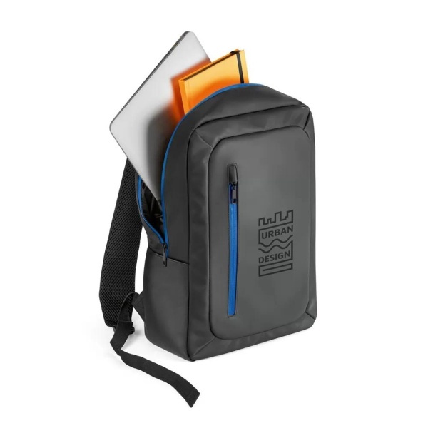 Mochila para notebook. Poliéster 600D impermeável. Compartimento principal almofadado para notebook até 15.6. Bolso frontal. Zípers impermeáveis. Bolso lateral em tela. Parte posterior almofadada, com sistema de apoio acolchoado para as costas e alças alm 280 x 400 x 110 mm NCMS:4202.92.00