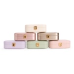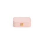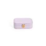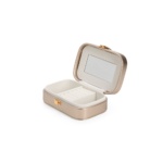 Descrição: Porta-joias em poliuretano (PU) e revestimento interno em tecido aveludado. Conta com espelho interno, duas divisórias, repartição almofadada com ranhuras e trava de segurança.