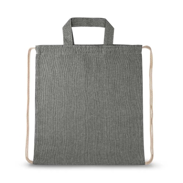 Sacola tipo mochila em 70% algodão reciclado e 30% poliéster reciclado (140g/m²), com alças 30 cm. O tecido é sem tingimento, é utilizado na sua cor original, sem produtos químicos de tingimento ou branqueamento, contribuindo para um menor impacto ambiental. 370 x 410 mm