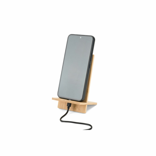 Suporte para celular em bambu, desmontável em duas partes. Contém um orifício que lhe permite carregar o seu celular enquanto utiliza o suporte. Fornecido em caixa presente de papel kraft reciclado. A cor e o resultado da impressão nos materiais naturais pode variar entre produtos. Dimensões montado: 80 x 130 x 80 mm | Caixa: 83 x 12 x 140 mm